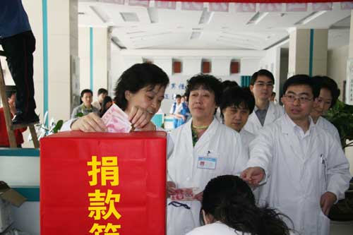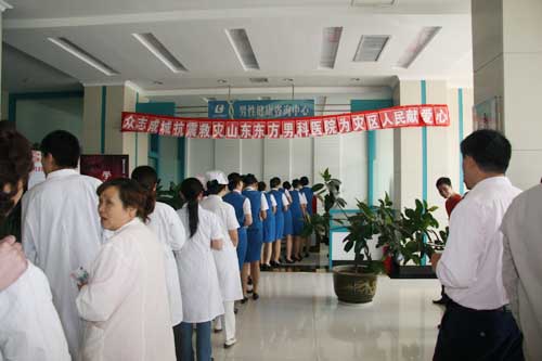 昨日,医院党支部在全院发出倡议,呼吁员工为灾区人民奉献爱心。活动得到了全体医护人员的积极响应,党支部成员带头捐款,各部门主任积极响应并做好组织工作,全体员工踊跃为灾区人民爱心。你 100元、他300元,大家抢着把钱投进募捐箱,在捐款现场,出现了感人的一幕。募捐活动开始不到半小时就募集到近1.5万元善款。该院还迅速筹集了价值近15万元的急救药品,目前首批善款及药品已经送往驻区红十字会。与此同时,该院还有近百名员工积极报名参与义务献血,支援灾区的医疗救治工作。据悉,为进一步支援赈灾工作,三台博爱男科医院正在组织免费为社会各界赴灾区志愿者体检,目前已为中石化等多家企业志愿者进行体检。