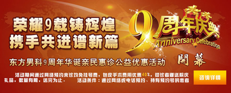 “荣耀9载铸辉煌,携手共进谱新篇”,山东东方男科医院迎来九周年华诞。为进一步减轻患者患者的就诊负担,我院联合中华医学会、中国中西医结合学会特举办亲民惠诊公益优惠活动,活动期间凡是通过网络预约来诊的患者均免挂号费。[详细]